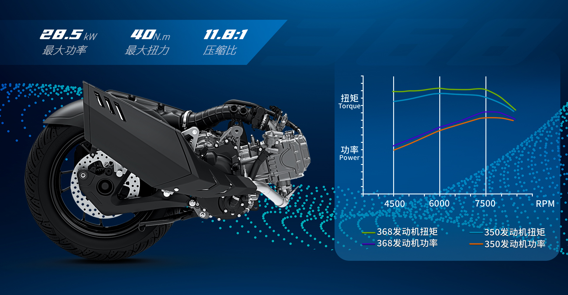 Zontes 368E trang bị khối động cơ SOHC, xi lanh đơn, dung tích 368cc, tỷ số nén 11,8:1, phun xăng điện tử BOSCH, làm mát bằng dung dịch, bình xăng 17 lít. Xe có thể đạt công suất tối đa lên đến 28,5kW tại 7500 vòng/phút, mô men xoắn cực đại 40Nm tại 6000 vòng/phút, tiêu thụ nhiên liệu khoảng 3,5 lít cho 100km.